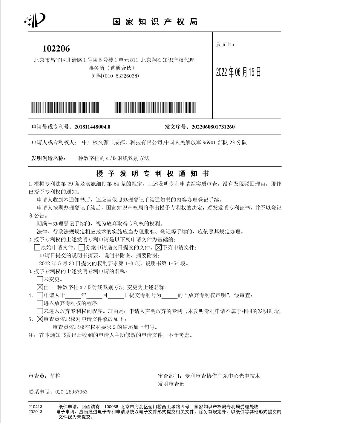 近日,中廣核久源(成都)科技有限公司(以下簡(jiǎn)稱“久源公司”)收到國(guó)家知識(shí)產(chǎn)權(quán)局“授予發(fā)明專利通知書”,明確由久源公司主持的發(fā)明專利《201811448004.0 一種數(shù)字化的α/β射線甄別方法》(專利號(hào):201811448004.0)申請(qǐng)通過(guò)實(shí)質(zhì)審查,榮獲發(fā)明專利授權(quán)。