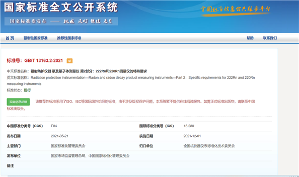 近日,由中廣核久源公司牽頭修定的國家標(biāo)準(zhǔn)《輻射防護(hù)儀器氡及氡子體測量儀第2部分:222Rn和220Rn測量儀的特殊要求》GB/T13163.2-2021,經(jīng)國家市場監(jiān)督管理總局、中國國家標(biāo)準(zhǔn)化管理委員會于2021年5月21日批準(zhǔn)發(fā)布生效,于2021年12月1日正式實施。